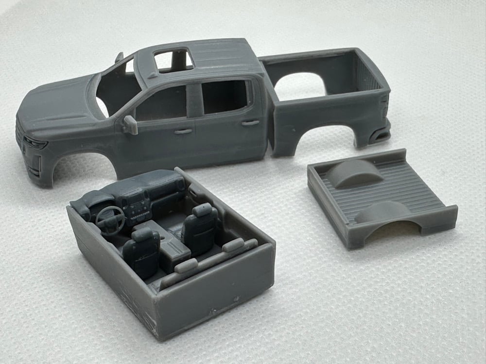1/64 scale 3d printed model kit Modeling skills recommended Chassis not incl Sanding may be necessary Body-raised bed-int tub-seats-console-dash-grill and clear plastic for windows